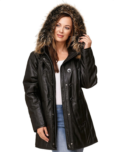 Damen-Lederjacke, gefüttert,feinstes Lamm-Nappa, lang, schwarz mit abnehmbarem Fuchsfell